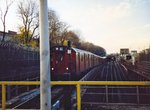 At 9th Avenue, the West End Line uses the upper level. There used to be a pedestrian crossing over the center express track at the north side of the station that also provided TA employees access to the 36th Street Yard. Until recently, there was never a "no admittance" sign; in the last few years, one was erected. That perch provided for some great shots of trains coming from the 4th Avenue subway. However, good shots can still be taken from the platform level.