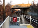 Next up is Richmond Valley, a flag stop nestled between Page Ave. and Richmond Valley Rd. Exit from the Tottenville platform and end of the two wall platforms is up while the St. George platform exit is down. This station is in need of renovation. A grade crossing at Richmond Valley road was removed in 1940. The Tottenville-bound track has a non-electrified spur that once ran all the way to the Arthur Kill. The spur was built in the mid 1920s and dubbed by the B&O as the West Shore Line. The B&O delivered building materials to the Outerbridge Crossing construction site near the Kill. There was also a small industry on the spur known as Roselli Bros. The track remains intact today all the way to Page Ave. The switch at the spur is well kept and working. Note in the image taken from Page Ave., that the spur still extends quite far from the station, and the creek that runs parallel to the track. Very bucolic indeed! A St. George bound SIR train is visible in the background.