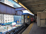 NW Two side platforms, three tracks. Full windscreen treatment along the platform. The exit to the mezzanine is in the center and is accented with bright blue at the top of the stair cutout. The back of stairs are red as are the skirt boards of the stairs and the lower woodwork in the mezzanine. The mezzanine itself is clad wood and has an extra exit to the west. There is a free crossunder. A view of Sunnyside Yard can be had through peepholes in the windscreen and from the mezzanine. The rails around the stairs are light blue in color. A two story tower is just to the south of the station in between the two tracks, the third track ending just north of this tower. The station is 2.5 stories above the ground.