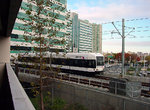NJT-HBLR LRV no. 2044 at the Marin Blvd. overpass in Jersey City. Photo by David Pirmann, April 2012.