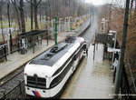 Norfolk Street. The first of the stations in the open cut Morris Canal basin. The tile is white, having been placed on top of the original concrete walls. The top features three narrow tile bands of Orange, Mauve and Purple-- the NJT logo colors. Exits are up at both ends.