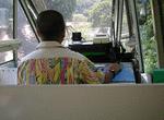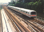 Operation is totally automatic. In fact, there is no cab; the trainsets have a similar appearance to airport peoplemovers -- with a covered drivers' console that can be used in an emergency. In a throwback to tradition, there are two railfan windows, one at either side of the front car. In automatic operation, dwell time is set and doors close automatically after a warning signal. I saw no door holding at any time, even during rush hour. There are supposedly roving customer service personnel; I thought I saw one sitting in the middle of the train. He wasn't wearing a uniform, but was holding a two-way radio.