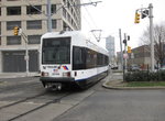 NJT-HBLR LRV no. 2044 at the Marin Blvd. overpass in Jersey City. Photo by David Pirmann, April 2012.