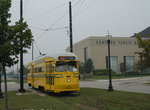 The City of Kenosha constructed an electric streetcar system utilizing historic PCC streetcars in coordination with the Harborpark Development on the shores of Lake Michigan. The Kenosha streetcar system will connect the 64 acre Harborpark development into the existing central city area and the METRA commuter rail station. Installation of the track subbase was completed in the fall of 1998, and the streets in Harborpark were completed in the fall of 1999 including the streetcar track. Electric overhead construction was completed in April of 2000. The first of five ex-Toronto PCC streetcars was delivered on Thursday, May 4, 2000. Each car is painted in a unique livery that represents a transit system that operated PCC streetcars. The dedication of the Streetcar line and the new Transit Center was held on June 17, 2000, with scheduled service starting on June 19, 2000