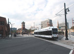 Newark Light Rail LRV #102 at the Lackawanna Broad Street Station on the first day of service. Photo by Frank Pfuhler, July 17, 2006.