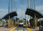 Leaving Florin, the line swoops over Florin Road on its only overpass, made necessary by the volume of traffic. In another mile, riders will arrive at the current end of the line, Meadowview Station. Curved canopies line the west track--currently the only one in use (in most cases). The mosaic artwork is embedded in the canopy supports. Another large and expandable parking lot is at Meadowview. Track storage for up to six LRVs is just south of the station, and the walkway to Meadowview Road parallels the stub tracks.