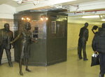 The Newark Subway operates out of the lower level, the entrance to which is located in the extreme northeast corner of the station. Stairs descend to an intermediate level where there is a old wooden token booth and artwork in bronze of subway riders. This artwork is entitled The Commuters by Gregory Gurevich and was installed in 1994. Down one more flight from the mezzanine level, the subway station has five low platforms with a wooden crosswalk between them (kept closed). Only the two side platforms are used for regular passenger service. Lighting is fluorescent and walls are tan tile. Passengers exiting the station use an escalator which bypasses this intermediate level directly to the Penn Station street level concourse.