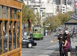 (image 108046) (272k, 930x618) Country: United States City: San Francisco/Bay Area, CA System: SF MUNI Location: Market/Laguna/Guerrero/Hermann Car: Milan "Milano/Peter Witt" (1927-1930) 1895 Photo by: Peter Ehrlich Date: 10/24/2009 Notes: Inbound. Partial side view. With 1818 (Milan 2-tone green) outbound. Viewed (this week/total): 0 / 626