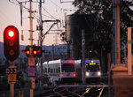 (image 58998) (206k, 864x569) Country: United States City: San Jose, CA System: Santa Clara VTA Line: VTA Vasona Line Location: San Jose Diridon Car: VTA Kinki-Sharyo 983 Photo by: Peter Ehrlich Date: 01/22/2007 Notes: Inbound and outbound trains passing a train in the Diridon layup track. Viewed (this week/total): 1 / 1614