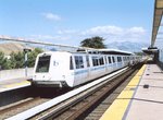 Leaving Walnut Creek, the elevated concrete structure heads northeast to Pleasant Hill, another side platform structure. Returning to grade level, the right-of-way is nearly on the alignment of the Sacramento Northern, an interurban line built a century ago and abandoned in the 1940s. The Concord Yard is east of the right-of-way at this point.