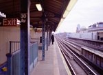 NW Two side platforms, three tracks. Full windscreen treatment along the platform. The exit to the mezzanine is in the center and is accented with bright blue at the top of the stair cutout. The back of stairs are red as are the skirt boards of the stairs and the lower woodwork in the mezzanine. The mezzanine itself is clad wood and has an extra exit to the west. There is a free crossunder. A view of Sunnyside Yard can be had through peepholes in the windscreen and from the mezzanine. The rails around the stairs are light blue in color. A two story tower is just to the south of the station in between the two tracks, the third track ending just north of this tower. The station is 2.5 stories above the ground.