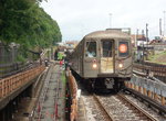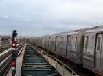 After leaving Bay 50th St, an S curve takes you from the El structure (4.5 miles long) onto grade level, with the massive Coney Island shops right beside you. Then the line crosses Coney Island Creek and rises again before entering Stillwell Avenue, the terminal station.
