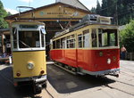 The line opened with trams built by “Busch” in the German town of Bautzen. This firm built trams for many cities in Germany and also U-Bahn cars for Berlin. Today Bombardier Transportation builds trams in Bautzen. Presently, the system uses trams formerly operated in the city of Gotha, with two axles. Operation is typically by a single motor car or a single motor car and a trailer. In 1998 tests were performed with a low-floor tram, but modern trams were deemed too expensive and aesthetically incompatible with the landscape.