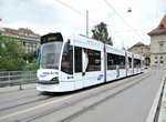 Bern Combino tram no. 670 in the Old City on Marktgasse, approaching Zytglogge. Photo by David Pirmann, July 2012.