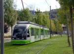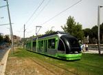 The EuskoTran ("Basque Tram") was proposed in 1998 after the opening of the Guggenheim Museum on the Nervión River waterfront. The chosen route connects two rail stations, and along the way passes the Guggenheim museum and an exposition center. Construction began in 1999 and the line opened near the end of 2002. The meter-gauge line is approximately 5 km long, with approximately 2 km of single track east of Pío Baroja to the eastern terminus at Atxuri railway station. Rolling stock, built by the Basque region's own C.A.F., consists of eight 24m long low-floor trams, with capacity for 192 passengers each, built at a total cost of EUR 18 million. The trams are numbered 401 to 408. The depot is located east of Atxuri station. Tram stops/locations pictured: Abando, Pío Baroja, Uribitarte, Guggenheim.