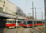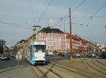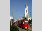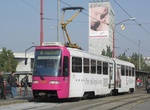 Tatra K2 - Articulated cars which, whilst similar in appearance at the front and rear to the T3SUCS cars above, are smaller and feature a partialy-corrugated side, very similar to that on New York's R32/38 subway cars. The most obvious difference is that the K2 cars are three-truck articulated cars with a turntable between the two sections of the car. As their capacity is lower than that of the other types of cars in the fleet, they seem to be restricted to quieter routes 3 and 13. Many of these cars have been rebuilt - see below.