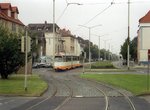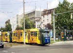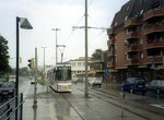 Braunschweig Alstom LHB GT6 tram no. 8165 at Lincolnsiedlung. Photo by Bernard Chatreau, August 2002.