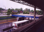 Immediately after passing the yard, we enter the station at Rosemont (5800N / 10500W). This station serves the large cluster of hotels and convention facilities that form the bulk of Rosemont's development at the gateway to O'Hare, and was once the terminal of what is now the Blue Line until the O'Hare extension was built in the mid-1980's. The station, formerly named River Road, features a large Park-'n'-Ride lot and bus loading area. Many Pace and CTA busses that serve the O'Hare area and the northwest suburbs terminate here. The station, like all the stations from here through Addison, is located in the median of the Kennedy Expressway. Rapid transit lines in the medians of expressways are not uncommon in Chicago, with most station accessed from stairs and/or ramps leading down from overpasses above. Rosemont is unusual in that access to the platform and fare control area is actually below the expressway. Irving Park, which we will encounter later, is the only other highway median station in Chicago accessed from below. A tunnel leads from the parking and bus loading area under the outbound lanes of the highway to a large fare control area. Escalators, stairs, and an elevator provide access to the platform above. The tunnel and stairs are of an interesting architectural design, and deposit riders at the west end of the island platform. The wide platform becomes much more narrow toward the eastern end.
