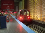 Upon leaving Clark / Lake, we round a sharp curve toward the south under Dearborn Street and enter a series of stations that is unique to Chicago, essentially a single long subway station that stretches the entire length of the Loop. The center platform is several blocks long, with entrances at every block along its length. Trains stop at various locations along the platform, each stop named after whatever east-west cross street is above. Stations along this section feature vaulted ceilings painted white. Each "stop" in this section is served by a mezzanine at each end of the stop, although some mezzanines are exit-only. This so-called "continuous platform" is the same as that of the CTA Red Line's State Street Subway, running parallel to us one block to the east. The only major difference is that the Dearborn section is slightly shorter, and lacks the blue acoustic panels found in the State Street portion.