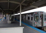 Leaving Pulaski, we pass a large intermodal facility, make the stop at Kedzie (3200W / 4900S), and pass through an industrial area before entering the station at Western (2400W / 4900S). If we were to travel southward along the length of Western Avenue, Chicago's longest street, we would pass a grand total of five CTA stations all named Western. This is the southernmost station, located at a point where Western Avenue is a wide tree-lined boulevard. The bus loading area is in the median of the boulevard, to the north of the station.