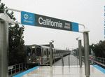 The next station is California (2800W / 2100S). This station has a new island platform of concrete, replacing a former station of wooden side platforms. Fare control is at street level below. During reconstruction, a temporary station was built just beyond the current platforms.
