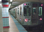 A short distance further south is Washington (100N / 1E/1W). The mezzanine of this station was recently enlarged, and elevators and new escalators installed. New tilework is similar to the tilework we saw being installed at Chicago Avenue. This station provides a transfer to the Blue Line via a block-long passageway to the CTA Blue Line's Dearborn Street Subway</a>, essentially a carbon copy of the State Street Subway. This station also provides Pedway access to Marshall Field's department store, the Metra Electric terminal at Randolph Street, as well as the nearby City Hall and government office buildings.