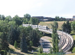The line now steeply dips, and into the Bow River Valley, over Deerfoot Trail (the city's super-expressway), and curves to a stop at Zoo. As its name implies, this island platform, underground mezzinane station serves the Calgary Zoo.