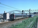 The line now crosses the the Cuyahoga River and enters the Tower City (formerly Union Terminal) area on the railroad-built bridge/embankment structure. Just as the line enters the complex it is joined by the tracks of the 1995 Waterfront Extension of the Green and Blue LRV lines (see below). Tower City-Public Square, as it is now called, is the renovated Terminal Tower development mentioned above. While the inter-city trains no longer pass through, the transit lines converge here and the former station has been turned into an urban mall with multiplex movies and the predictable Gap, chocolate chip cookies, and chain music stores. The original transit trackage and platforms have been reconfigured with the extension of the Green/Blue lines to the Waterfront.