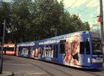 Four trains, two K4000s and two 2200s received a special large logo-design with KVB's new logo. It was attached to the first cars in September to October 2004. The whole fleet except for the maintenance-of-way equipment received this new company emblem. However, some cars managed to refuse the new logo and still have not received one while to some cars the new one was attached but someone forgot to remove the old logos! It is worth mentioning four cars in this context, because the new logo was used for an own advertisement of the KVB an cars 2224, 2238, 4007 and 4097. Huge new logos were applied to these cars' sides fitting the red cabs. Once more we have a change in a change. The 2000/2100-series used to have the car number attached to the front center right under the windshield. In October 2004, the first 2000s and 2100s appeared with the new logo simply attached above the number resulting in a front that looked somewhat "jammed". Obviously the KVB shared the opinion of most drivers and railfans and rearranged its lettering-rules for the 2000s and 2100s. This design problem evolved on these two types only, because of their front design in two steps, the lower "bar" carrying the built-in headlights on the side. And this bar is part of the actual design, because the center of it now hosts the car number and the new logo was put in place right in the center of the front where the car-numbers used to be.