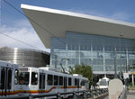 The route curves northward and passes Six Flags Elitch Gardens, an amusement park hard by the river. Another station stop is located at Pepsi Center-Elitch Gardens, where the Denver Nuggets basketball team plays. There is a long overpass at the north end of the station. There are three tracks here, but one is used to stage extra trains only. Next, the route continues, paralleling the railroad to the 16th Street Bridge, a pedestrian walkway with a spectacular white mast projecting outward like that of a clipper ship. The route curves onto 16th Street and then left to Union Station (aka "Union Station/LoDo/Coors Field/16th Street Mall". Inbound patrons must get off here, and the light rail train will terminate north of the station and change ends. There are center and side platforms here. It's a short walk to the 16th Street Mall buses and a long walk into Union Station itself.