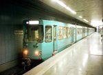 The U7 uses trains of class U2e (6-axle articulated units built 1968-1978, length 23.00m, width 2.65m). The U6 typically uses trains of the class Ptb (8-axle articulated units built 1972-1978, length: 27.43m, width: 2.35/2.65m).