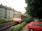 Frankfurt am Main Duewag U2 class trams at Lindenbaum on Line U1. Photo by Jos Straathof, August 2006.