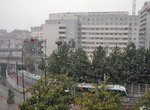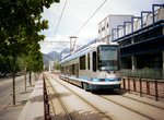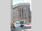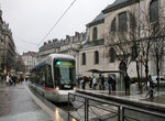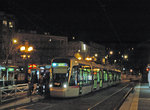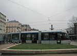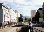 Line A runs from Fontaine La Poya in west Grenoble, with the terminal situated at the base of a mountain. From here to Louis Maisonnat, the line serves several neighborhoods of one-family houses and small businesses, using reservation. At Louis Maisonnat, the line curves left and now serves more built-up communities with multi-story apartment buildings. Some street running is encountered now; the trams cross the River Drac on a short arch bridge and then re-commence street running at Berriat. Line B joins Line A at Saint-Bruno, following which the tracks dive under the railway and emerge at Gares, by the main railway station. Here, the trams now make a U-turn to the right and enter Rue Alsace Lorraine, and from this point it's a pedestrian mall through Centre-Ville--trams and "pietons" only, with plenty of restaurants, sidewalk cafés, boutiques and open-air markets to whet everyone's appetite. Stations are located at Alsace Lorraine and Victor Hugo, and the trams pass historic St. Louis Cathedral before reaching Hubert Dubodout Station. About 200 meters further east, the routes separate and Line A turns south and runs around historic Place Verdun, where there are many fine museums and other cultural attractions. Now Line A will head southward along Avenue Martin Berthelot, in reservation, until it reaches Grand Place, a major transfer center. Here, the line does a complete change of direction, first turning east, south again and west to Maison des Anciens before curving south one last time enroute to Denis Papin. The tram depot is located just beyond Les Granges Station.