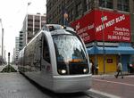 18 sleek new 6-axle, 70% low floor LRVs built by Siemens provide service 19 hours a day. Normal service is with single-car trains, but the LRVs can be coupled in 2-car sets, which were used on Opening Day and on Super Bowl Sunday. Siemens also provided the power generating system for the trains. The car type is nicknamed "Avanto".