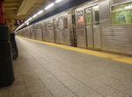ACE Four tracks, two island platforms. This is the last Manhattan express station. Tile color is the same as Spring Street, and there is a "Canal Street" mosaic. The platforms are offset due to switches between local and express at both ends. A crossover between directions is at the southernmost stairs only. The full size mezzanine has been reduced by a police precinct and fare control is now in the center. The station is being renovated, but the floor tiles are already cracking and are marked for replacement.