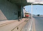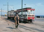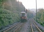 Manx Electric Railway train at the Laxey river crossing, approximately 1970.