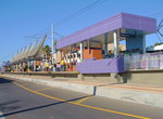 Leaving Union Station, the line ramps up onto an elevated structure--the only such alignment on the entire system--crossing over tracks for private car storage and across busy Alameda Street to the spectacular center-platform Chinatown station, shaped in Chinese-style architecture to complement the neighborhood. The rider has quite a panoply of views here--downtown L. A. highrises on the left, the Union Station complex and its approach from the Los Angeles River on the right. Departing eastward from Chinatown the trains descend from the elevated structure and pass an area known as the "Cornfields", site of former railroad yards primed for future development, and then pass under the Buena Vista Bridge.