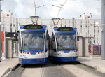 The no. 15 tram line operates from the downtown square Praça da Figueira, through Praça do Comercio, then out to Belém and Algés to the west along the Tagus River waterfront. Along the way it passes the tram depot at Santo Amaro. This line is operated with modern low floor articulated trams built by Siemens in 1995, which are 24 meters long and carry 210 passengers. The cars are single-ended with doors only on the right side. Some of the service is supplied by the vintage single-truck trams.