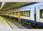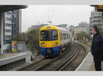 The trains themselves -- new Bombardier class 378/2 'Capitalstar' four-car units, giving a pretty smooth ride, are generally liked by the travelling public. The line was formerly operated by 50-year old Underground A60 stock. The mostly white livery will attract graffiti, though. All seating longitudinal -- but comfortably upholstered; and, a first for London, you can see all the way through the four cars, as on the Paris Meteor line, and this feature attracted favourable comment from many of the passengers. This variety of the class 378 has third rail collection only; other subclasses, for use on other parts of the Overground, have dual electrification.