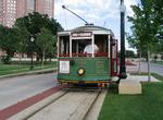 The trolley now heads back to McKinney Avenue and will turn right (through a spring switch) and run a half block to Blackburn, where it will turn left (north), operating along the west side of the street in a separate right-of-way facing southbound traffic. The streetcar will turn left again at Cole Avenue, where it will hug the south curb lane. A left-side stop is made at Newman Street, after which the rails reach Lemmon West. Here, the car will make a wide S-curve and pick up Cole Avenue again. This stretch of Cole is dotted with older homes and is probably the most picturesque portion of the line. At Hall Street, the old original line from 1989 joins up (inbound pull-out cars still use this turn). Finally, at Allen, the line sweeps left in a broad curve and rejoins McKinney (after passing the ubiquitous Starbucks). Double track continues for another mile or so, to St. Paul. Total running time is about 45 minutes.