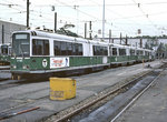 The "Standard" LRVs (3400-3543) were built jointly for Boston and San Francisco in 1976-78 by Boeing-Vertol and feature flat ends, flat panels at the articulation, and a fairly smooth roof line. They use hand control, and run in trains of up to three cars. Of 175 originally ordered, 135 were delivered before the order was cancelled due to various problems with the equipment. Later, San Francisco took some of the undelivered cars before Boston claimed the last 9. Replacement of couplers, air compressors, air conditioning units, wheels, major articulation components and the entire door system made the remaining 55 LRVs reliable but have since been retired.