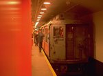 Just down the tunnel, and alongside the opposite platform we come into Downtown Crossing, formerly known as Washington. Here a transfer to the Red Line can be made, and there is direct access to the underground portion of Filene's department store.