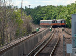 Approaching Wellington station, you can see the shops and yard just west of this stop. This is the primary maintenance facility for Orange Line as well as equipment and storage. At Wellington a third express track peels off and follows the route southward. All stations south of here to the subway feature 2 platforms, split by three tracks. The express track is seldom used, and is part of the route to the subway portal.