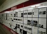 From the fare lobby, escalators and elevators provide the primary access to the subway platforms with the nine flights of stairs intended for emergencies only. The inbound platform lies above the outbound one with fully accessible connections between them. The inbound (upper) level is approximately 85 feet below the surface, with the outbound (lower) level approximately 100 feet below. From the upper level one can look down over a balcony railing to the lower level platform and track. Not too many rapid transit stations are built like this, and Boston has two! (Harvard is the other, and Rosslyn station in Washington D.C. is another.) Both levels share a single tube of about 40 feet in diameter. The inner surface of the station tube is covered with perforated metal panels, painted an off white. Various points around the station are adorned with bronze castings of discarded gloves.