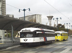 Philadelphia PTC 1940, silver & cream with blue trim. Rehabilitated from SEPTA PCC. Former SEPTA #2121. Although painted for one of its home city's liveries, this car never carried this paint scheme while in Philadelphia. Status: Out of service due to accident 11/16/2003 (rear-ended at high speed by Breda 1541 on San Jose Avenue); will be used for parts and will not return to service (see also #1060).
