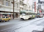 Sacramento Northern rostered a small fleet of Birneys for its local streetcar services in Sacramento, Chico, and Yuba City/Marysville, CA; the latter proved to be SN's last passenger service, abandoned in 1948. Birney 62 was purchased by the Bay Area Electric Railroad Assn. and made two appearances in San Francisco. The first time was a special fantrip on January 21, 1951, when 62 operated over many of the remaining Muni lines, including the out-of-service, but still in place, trackage to the Ferry Building. The second instance was set up for the possibility of running the car in 1984 Trolley Festival service, and on May 19, 1984, 62 made one trip from Metro Yard to Transbay Terminal. The Birney's railroad profile wheels proved to be no match for Muni's girder rail, and the little car ran on its flanges most of the time, kicking up sparks all the way. The experiment was therefore a failure, and 62 returned home to the Western Railway Museum the next day.