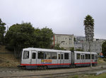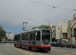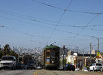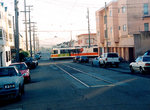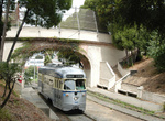 The Sunset Tunnel, almost a mile long, is probably the main reason the N Judah line survived bus substitution. Today, the N line is the busiest metro line and features two car trains most of the time as well as short headways. Emerging from the western portal of this tunnel, the N-Judah line runs in the center of narrow, residential Carl Street for about a dozen blocks. A short S-turn near the UCSF Medical Center jogs the line over to wider Irving Street. Continuing west nine blocks the line again shifts streets finally attaining Judah Street.