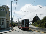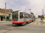 MUNI Breda LRV 1401 switching back on crossover on Ocean Avenue west of San Jose Avenue. Photo by Peter Ehrlich, June 2005.