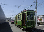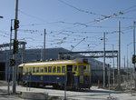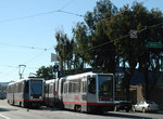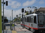 After Revere, the line makes another gentle right-hand curve, dips downgrade, and continues mostly straight for another mile, making a side-platform stop at Williams Street (formerly Van Dyke Avenue). Already new housing developments are cropping up in anticipation of Third Street LRT. Next comes another curve between Wallace and Yosemite Avenues, followed by the Armstrong Avenue Wye, which juts off to the right, and can hold two 2-car trains. Then we reach a station and the second railroad crossing at Carroll Avenue. Here, the Union Pacific switches freight customers on this railroad branch, which leads into the Naval Base, serving the Golden Gate Railroad Museum, home for the 1921-vintage Southern Pacific P-8 class 4-6-2 2472, which occasionally ventures out for excursions onto the Caltrain main line from which this branch juts off.