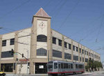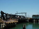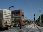 Next we come to 20th Street, in the heart of the Dogpatch Historic District, with scattered Victorians interspersed with commercial buildings. Again, this station is alternating side-of-road high level platforms. The aforementioned 22-Fillmore trolley coach line and the 48-Quintara/24th Street bus route exchange passengers here. The giant Continental Can Company factory, now occupied by numerous small business enterprises and artistic organizations, is on the left, between 20th and 22nd Streets. Another station is located at 23rd Street, and two blocks later, on the left, are half-grand union turnouts at 25th and Cesar Chavez Streets which will access the Metro East Light Rail Maintenance Facility. This is followed by a station at Marin Street, which has its platforms setup reverse of normal, with the outbound side north of the inbound platform. Next comes the double drawbridge over Islais Creek, followed by a crossing of the Union Pacific Railroad at Cargo Way. This is one of two LRT/railroad interfaces on this route. The Cargo Way branch is used by trash trains and other services for individual rail customers.
